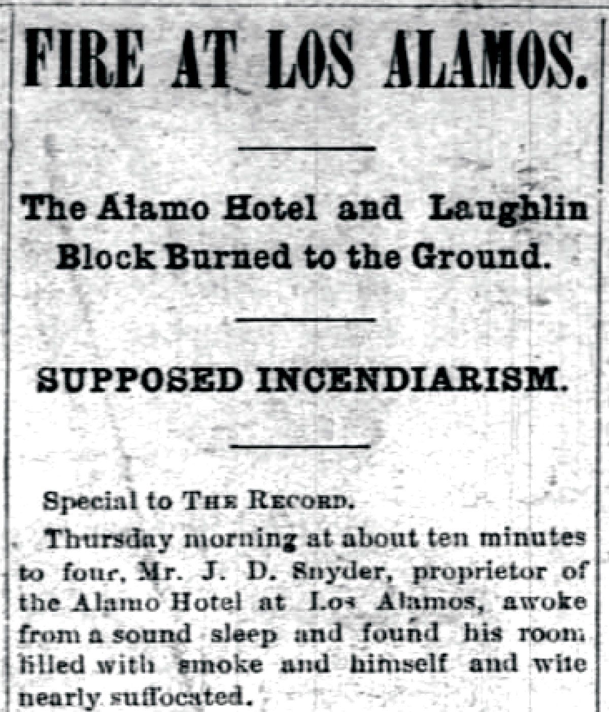 The town of Los Alamos was founded in 1876, when the stagecoach line was rerouted through the area and two local ranchers realized an opportunity. Four years later, local Wells Fargo agent J.D. Snyder built the 1880 Union, a stagecoach home station complete with store and lodging. It burned down on February 16, 1893, but was rebuilt in 1915 as a hotel and saloon. The Santa Maria Times, on February 6th of that year, printed: